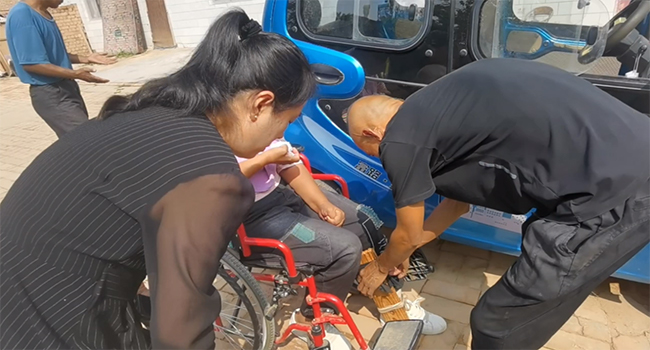第一次見到他時,他開著一輛十分狹小的電動車,膚色黝黑,穿著一件簡單的黑色T恤。車子停下后,他利索地來到副駕駛拉開車門,轉過妻子的身體讓她面朝自己,再將她的雙臂搭在自己的脖子上,撫平她因動作而上滑的衣角,小心輕柔地將妻子放到早已備好的輪椅上。