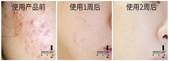 使用后狀態(tài):使用2周后,痘痘紅腫消退,不留痘印痘痕,皮膚更光滑細膩。