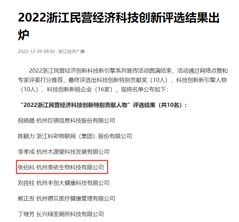 送人玫瑰手留香,博士為民好榜樣。2022年12月9日,浙江經(jīng)濟廣播宣布本次活動圓滿結(jié)束,并公布了最終結(jié)果。通過幾輪的網(wǎng)絡(luò)點贊和專業(yè)的專家評委打分,最終評選出科技創(chuàng)新特別貢獻獎(10人)、科技創(chuàng)新新引擎人物(10人)、科技創(chuàng)新新銳企業(yè)(16家)。杭州美依公司創(chuàng)始人——張伯科博士在本次活動中有幸被評為“2022浙江民營經(jīng)濟科技創(chuàng)新特別貢獻人物”,本次榮譽的獲得,也是對張伯科博士十年以來,在科技創(chuàng)新領(lǐng)域成就的肯定和嘉獎。