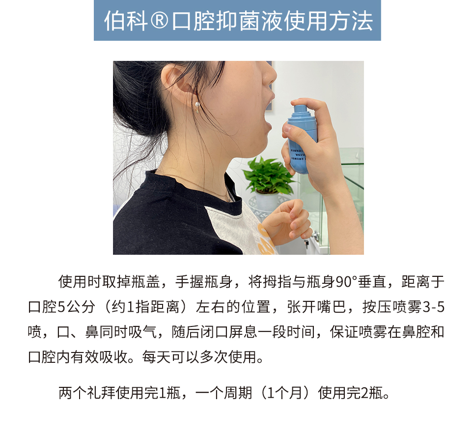 伯科®口腔抑菌液兼顧口腔和鼻腔黏膜的雙重防護(hù),成分天然,不含激素、重金屬等有害成分,吸入后無(wú)刺激、無(wú)副作用。放在家里作為常備防疫物品,不管是家里的小孩還是老人都能放心使用。