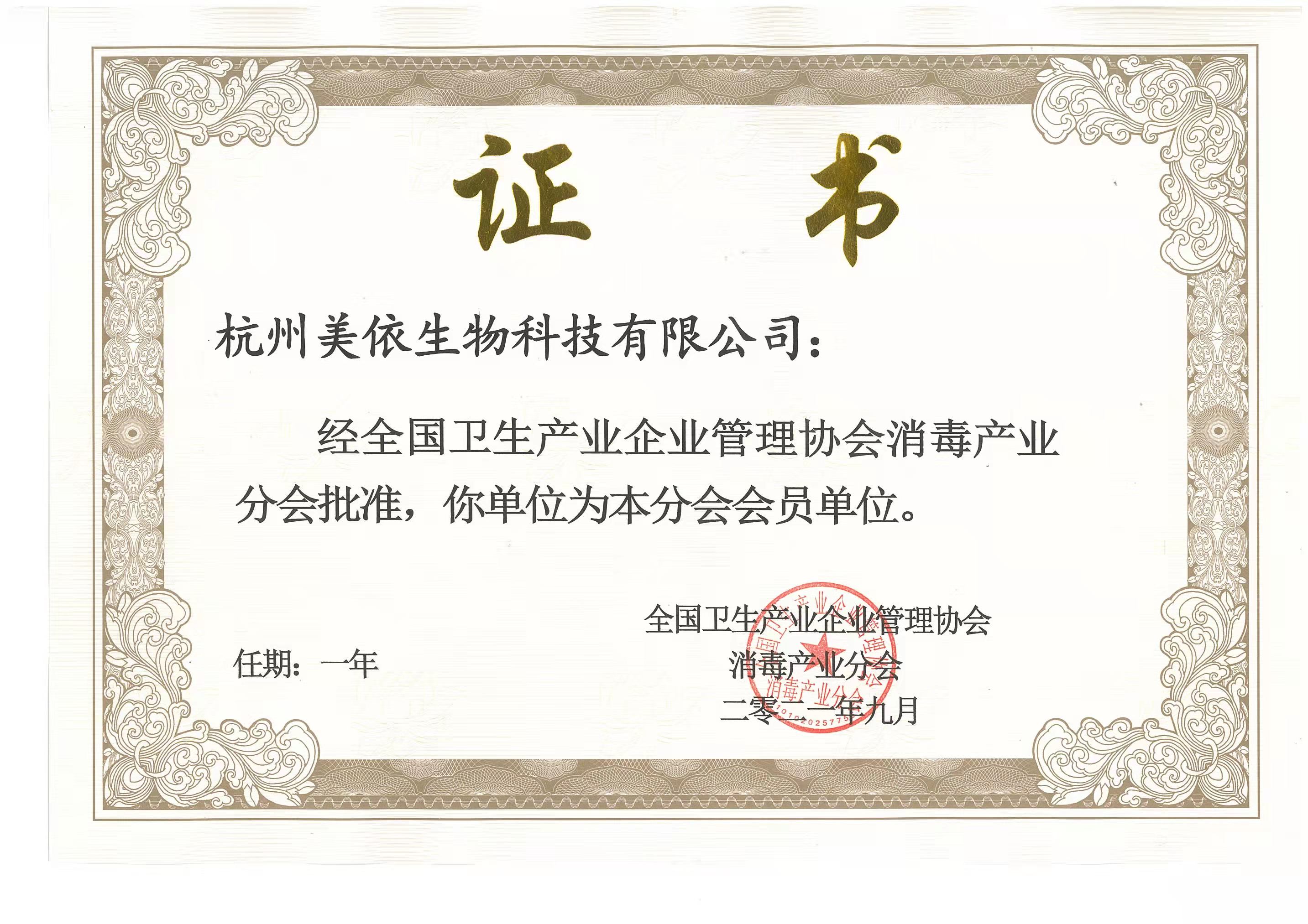 今天,杭州美依生物科技有限公司現(xiàn)已收到全國衛(wèi)生產(chǎn)業(yè)企業(yè)管理協(xié)會消毒產(chǎn)業(yè)分會的會員牌匾和證書。