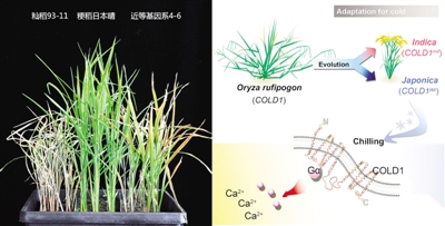 水稻起源于熱帶和亞熱帶,對(duì)環(huán)境低溫非常敏感,限制了其種植區(qū)域。人工馴化選擇使粳稻種植能延伸到低積溫帶區(qū)域。近年來(lái)全球氣候變化導(dǎo)致的異常氣溫頻發(fā),直接威脅水稻的生產(chǎn),而植物感知低溫機(jī)理知之甚少。中國(guó)科學(xué)院植物研究所種康研究組與中國(guó)水稻所錢前研究員等合作發(fā)現(xiàn)水稻感受低溫的數(shù)量性狀位點(diǎn)基因COLD1賦予了粳稻的耐寒性。該基因編碼一個(gè)九次跨膜的G-蛋白信號(hào)調(diào)節(jié)因子,定位于質(zhì)膜和內(nèi)質(zhì)網(wǎng)。遇冷時(shí)COLD1與G-蛋白α亞基RGA1互作,激活Ca2+通道、觸發(fā)下游耐寒防御反應(yīng);COLD1jap基因起源于中國(guó)野生稻而賦予粳稻耐寒性。這是國(guó)際上首次報(bào)道的植物低溫感受器,揭示了人工馴化賦予粳稻耐寒性的分子細(xì)胞學(xué)機(jī)制。該成果對(duì)于水稻耐寒性的分子設(shè)計(jì)改良有重要的指導(dǎo)意義和潛在的應(yīng)用前景。本研究成果在2015年7月《Cell》雜志上以封面論文發(fā)表。