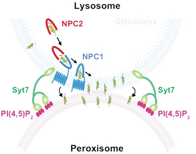 膽固醇是細(xì)胞不可或缺的脂類物質(zhì),其代謝異常會(huì)引起動(dòng)脈粥樣硬化和神經(jīng)系統(tǒng)病變。細(xì)胞內(nèi)膽固醇運(yùn)輸?shù)臋C(jī)制并不清楚。武漢大學(xué)宋保亮團(tuán)隊(duì)研究發(fā)現(xiàn),過(guò)氧化物酶體與溶酶體之間可產(chǎn)生動(dòng)態(tài)接觸,該過(guò)程由溶酶體上的SytVII蛋白結(jié)合到過(guò)氧化物酶體上的脂質(zhì)分子PI(4,5)P2來(lái)介導(dǎo)。膽固醇正是通過(guò)這一新型的細(xì)胞器的膜接觸,由溶酶體運(yùn)輸至過(guò)氧化物酶體。許多過(guò)氧化物酶體基因突變會(huì)導(dǎo)致發(fā)育和神經(jīng)系統(tǒng)功能障礙,該工作第一次揭示了膽固醇堆積是過(guò)氧化物酶體紊亂疾病的發(fā)病原因之一。這項(xiàng)研究不僅發(fā)現(xiàn)了細(xì)胞內(nèi)膽固醇運(yùn)輸?shù)男聶C(jī)制,揭示了過(guò)氧化物酶體細(xì)胞器的新功能,更重要的是為治療膽固醇代謝異常相關(guān)疾病提供了新的線索和思路。研究成果在2015年4月《Cell》上發(fā)表,同期配發(fā)了評(píng)述文章。