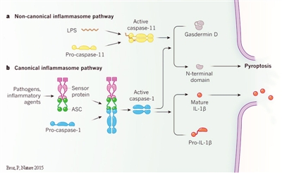 細(xì)胞炎性壞死(細(xì)胞焦亡,pyroptosis)是機(jī)體的重要免疫防御反應(yīng),在清除病原感染和內(nèi)源危險(xiǎn)信號(hào)中均發(fā)揮重要作用。細(xì)胞焦亡由炎性蛋白酶caspase(caspase-1和caspase-4/5/11)介導(dǎo),但具體機(jī)制完全不清楚。北京生命科學(xué)研究所邵峰團(tuán)隊(duì)和廈門大學(xué)韓家淮團(tuán)隊(duì)分別獨(dú)立鑒定出全新的GSDMD蛋白,并證明GSDMD是所有炎性caspase的共有底物,其切割對(duì)于caspase激活細(xì)胞焦亡既是必要的也是充分的。這些工作揭示細(xì)胞焦亡的關(guān)鍵分子機(jī)制,為多種自身炎癥性疾病和內(nèi)毒素誘導(dǎo)的敗血癥提供了全新的藥物靶點(diǎn)。邵峰和韓家淮論文分布在《Nature》(2015年10月)和《Cell Research》(2015年12月)上發(fā)表。