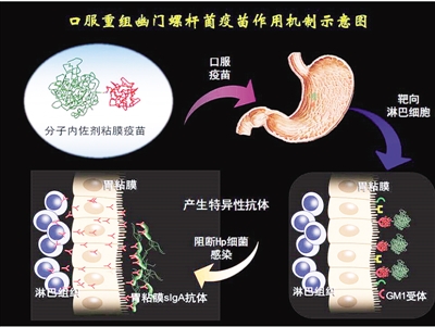 幽門螺桿菌(Hp)是慢性胃炎、胃及十二指腸潰瘍的致病菌,是胃癌的主要致病因子。我國(guó)胃病患者超過(guò)1億,每年因胃癌死亡者達(dá)20萬(wàn)人。第三軍醫(yī)大學(xué)鄒全明、中國(guó)食品藥品檢定研究院曾明和江蘇省疾病預(yù)防控制中心朱鳳才三位教授聯(lián)合研究,發(fā)明了“Hp分子內(nèi)佐劑粘膜疫苗”設(shè)計(jì)原理和安全高效的首個(gè)人用分子內(nèi)粘膜免疫佐劑;設(shè)計(jì)與制造出全新的Hp疫苗組份;研究出國(guó)際上首個(gè)Hp疫苗生產(chǎn)與檢定質(zhì)量標(biāo)準(zhǔn)。歷時(shí)15年,完成了Hp疫苗5000余人參加的臨床試驗(yàn),成功研發(fā)了具有完全自主知識(shí)產(chǎn)權(quán)的世界首個(gè)Hp疫苗,并安全、有效,保護(hù)率達(dá)71.8%,獲國(guó)家1.1 類新藥證書。