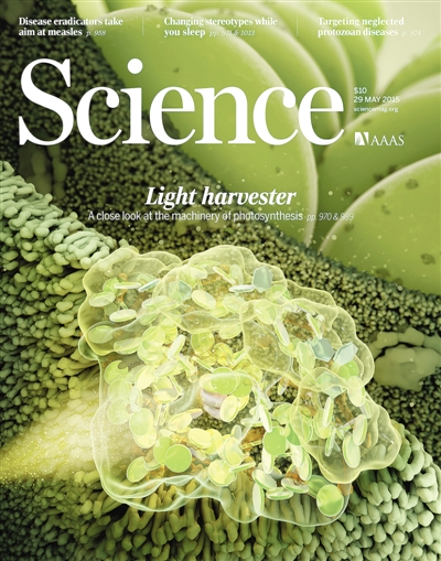 光系統(tǒng)I(PSI)光合膜蛋白超分子復(fù)合物是光合作用中高效吸能、傳能和轉(zhuǎn)能的系統(tǒng),其量子轉(zhuǎn)化效率幾乎為100%。中國(guó)科學(xué)院植物研究所匡廷云、沈建仁研究團(tuán)隊(duì)在原子水平分辨率的高等植物光系統(tǒng)I-捕光天線(PSI-LHCI)晶體結(jié)構(gòu),解析了高等植物PSI-LHCI的精細(xì)結(jié)構(gòu),其中包括16個(gè)蛋白亞基和205個(gè)輔因子,總分子量約600kDa;揭示光系統(tǒng)I的4個(gè)捕光色素蛋白復(fù)合體(Lhca1-4)在天然狀態(tài)下的結(jié)構(gòu)及相互關(guān)系,LHCI全新的色素網(wǎng)絡(luò)系統(tǒng)和LHCI紅葉綠素的結(jié)構(gòu),明確提出LHCI向核心能量傳遞可能的4條途徑。該研究成果對(duì)于闡明光合作用機(jī)理及提高作物光能利用效率和開(kāi)辟太陽(yáng)能利用的新途徑都具有重要的理論和實(shí)踐意義。該研究成果在2015年5月《Science》期刊以長(zhǎng)文的形式并作為封面文章發(fā)表。