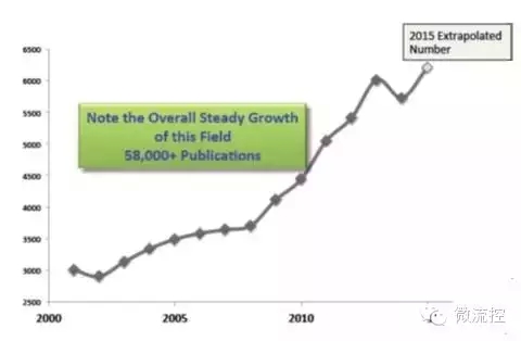BCC Research的一項(xiàng)分析報(bào)告指出,2014年全球單細(xì)胞分析(Single-cell Analysis)的市場達(dá)5.4億美金,預(yù)測將從2015年的6.3億美金增長到2020年的16億美金,復(fù)合增長率達(dá)21%。根據(jù)GENReports的報(bào)告,關(guān)于單細(xì)胞分析的文章發(fā)表在過去的幾年也有著爆發(fā)性的增長。