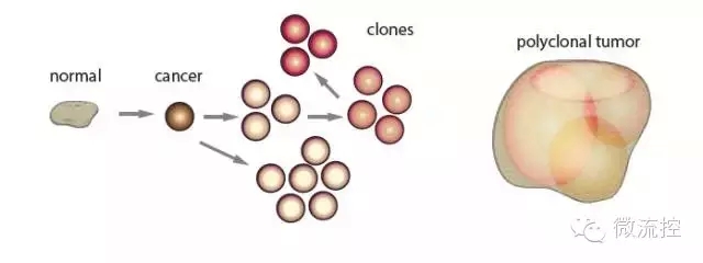 首先談一下癌癥的異質(zhì)性:中晚期的腫瘤或由一系列的腫瘤克隆組成,每一種克隆有著獨(dú)立的變異,形態(tài)和藥物反應(yīng)。對于腫瘤克隆精準(zhǔn)的診斷非常重要,因?yàn)橐粋(gè)占據(jù)原發(fā)性腫瘤5.1%的亞克隆種群在復(fù)發(fā)的時(shí)候可能成為主要的致病因素。