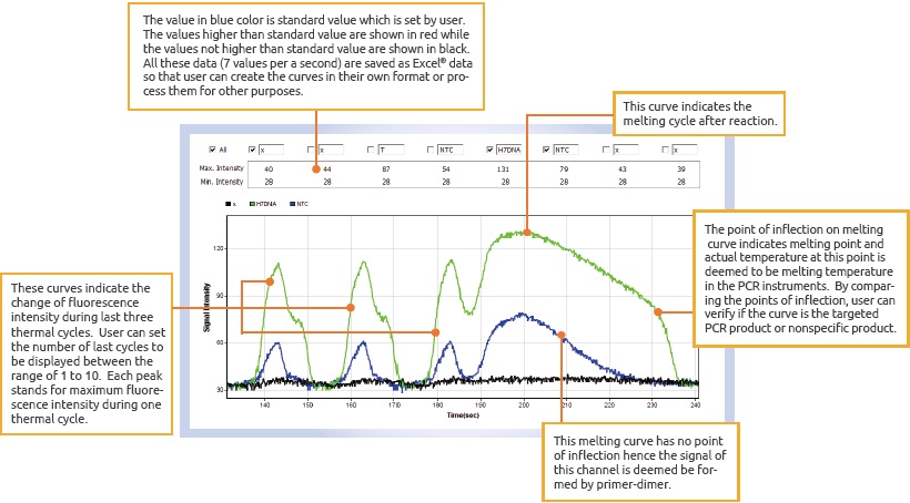 GENERECORDER軟件可以檢測(cè)最后1-10個(gè)循環(huán)的反應(yīng)芯片(Rapi:chip™)中熒光強(qiáng)度變化,數(shù)值結(jié)果可以以Excel格式導(dǎo)出,強(qiáng)度曲線以Jpg格式保存;