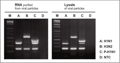 圖2.HelixAmp 直接RT-PCR試劑盒與傳統(tǒng)RT-PCR試劑盒多重檢測(cè)豬流感病毒效果比較。