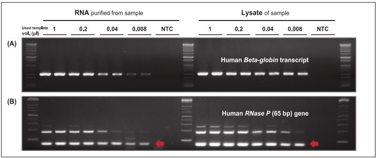 指用于直接RT-PCR或用于純化DNA的全血量(純化的RNA全部用于傳統(tǒng)RT-PCR),NTC:陰性對(duì)照。