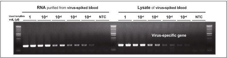 圖4.HelixAmp 直接RT-PCR試劑盒與傳統(tǒng)RT-PCR試劑盒檢測(cè)侵染全血中動(dòng)物RNA病毒的靈敏度比較。圖中所示Used template