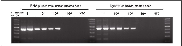 圖5.HelixAmp 直接RT-PCR試劑盒與傳統(tǒng)RT-PCR試劑盒檢測(cè)病毒侵染植物種子中瓜壞死斑病毒(MBSV)的靈敏度比較。圖中所示