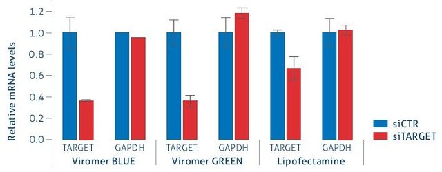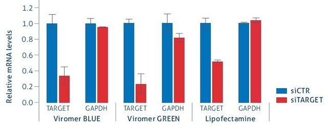 使用Viromer®BLUE /GREEN , Lipofectamine轉(zhuǎn)染siRNA 到原代小鼠成纖維細(xì)胞中,檢測目標(biāo)基因和GAPDH mRNA的表達(dá)