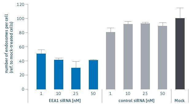 Viromer®BLUE轉(zhuǎn)染原代巨噬細(xì)胞,在384孔板中,使用Viromer®BLUE轉(zhuǎn)染siRNA targeting EEA1到原代巨噬細(xì)胞(從buffy coat PBMC 現(xiàn)分離)中,檢測endosomes 水平(siRNA targeting EEA1會導(dǎo)致endosomes 水平降低)